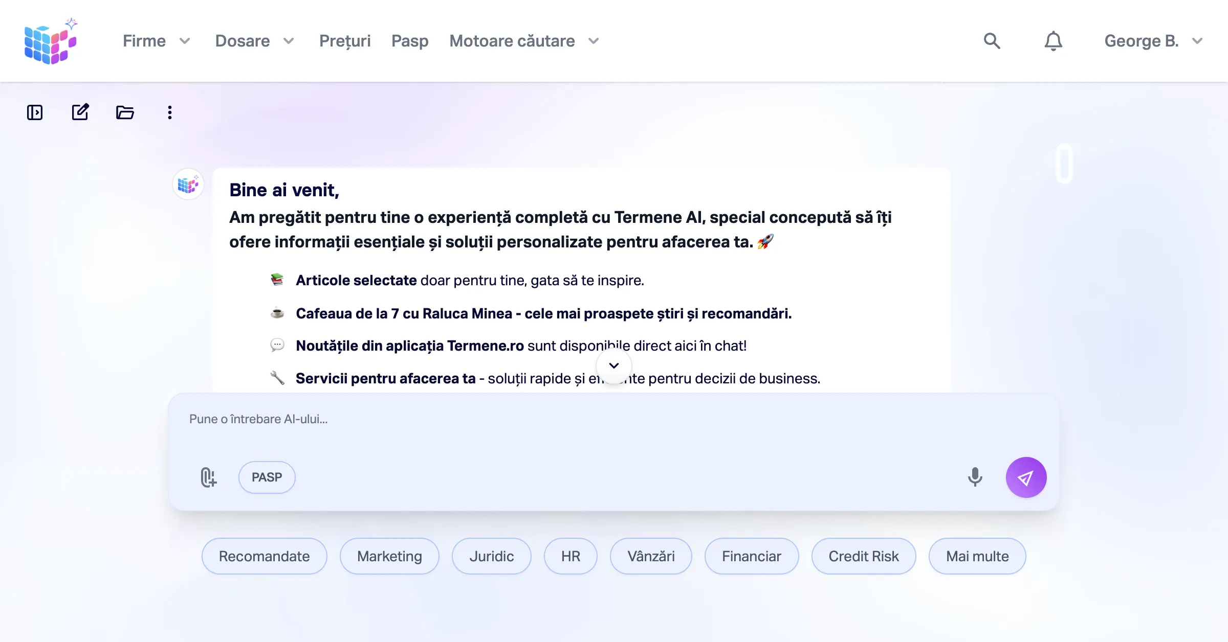 Un element inovator al platformei este integrarea AI prin asistenți virtuali care pot automatiza taskuri, genera analize financiare, interpreta documente contabile sau extrage informații relevante din datele publice. Fie că ai nevoie de o analiză rapidă a unui bilanț, de generarea unui grafic din documentația existentă sau de prospectarea pieței, AI-ul Termene.ro este pregătit să te ajute. Mai mult, grație profilului tău personalizat de pe Termene.ro poți să-I dai chat-ului AI o serie de surse (fișiere, site-uri, documente) din care să îți analizeze și gestioneze informațiile.