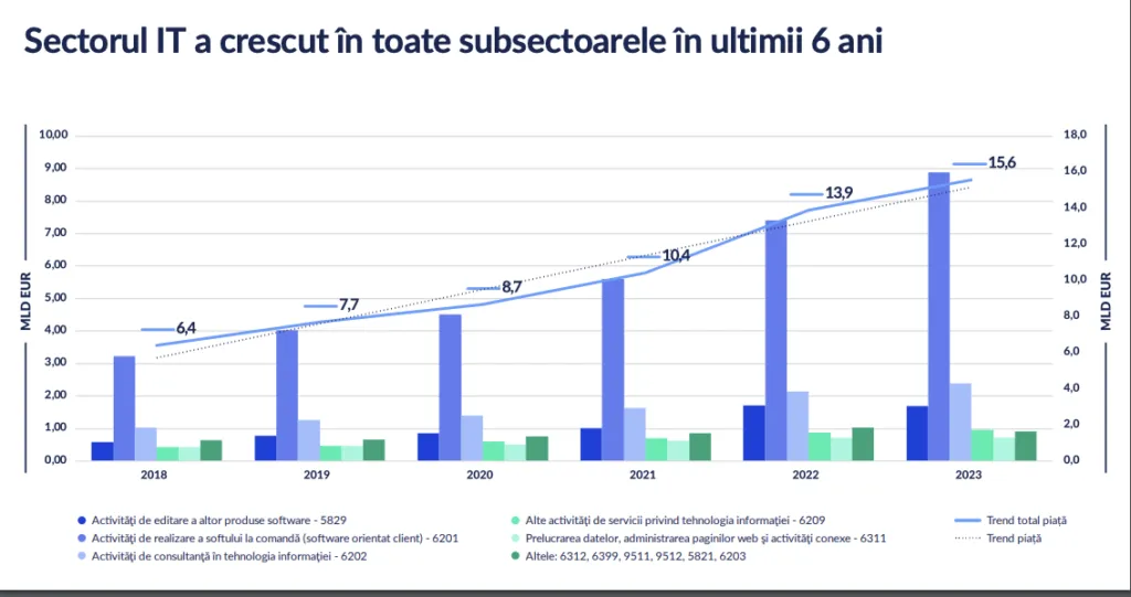 În ciuda acestor dificultăți, afacerile din sectorul IT au continuat să crească în 2023, atingând 15,5 miliarde de euro. Cu toate acestea, ritmul de creștere a scăzut semnificativ la 12,16%, comparativ cu o creștere de aproape 33% în 2022. Aceste cifre reflectă încetinirea generală a pieței și efectele directe ale schimbărilor de reglementare.