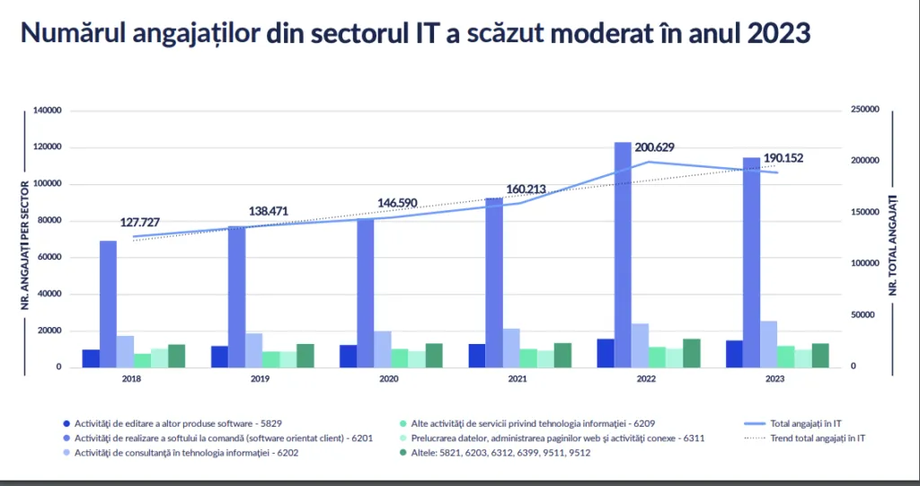 Studiul mai arată că în 2023, numărul de angajați din sectorul IT din România a scăzut la 190.152 de persoane, sub pragul de 200.000 atins în 2022. Deși scăderea nu a fost dramatică, reprezintă un semnal de alarmă pentru evoluția unui sector considerat până acum un motor de creștere al economiei.