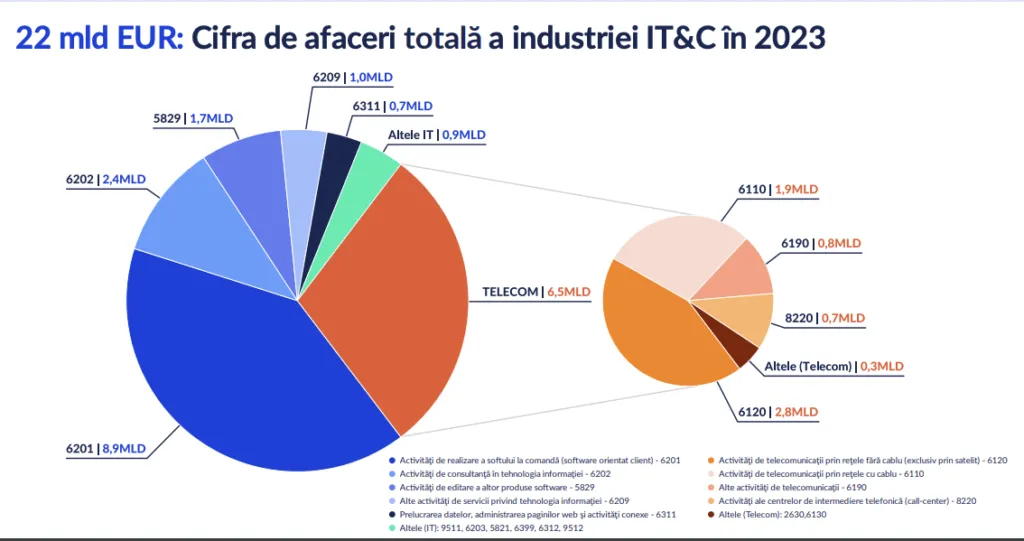 Per total, cifra de afaceri a industriei IT&C din România a ajuns la 22 miliarde de euro în 2023, cea mai mare valoare din ultimii ani. Sectorul IT reprezintă 8,9 miliarde de euro din această sumă, în timp ce telecomunicațiile contribuie cu 6,5 miliarde de euro. Principala componentă a industriei IT rămâne dezvoltarea de software la comandă, care a realizat 40,24% din cifra totală de afaceri a industriei și a înregistrat o creștere de aproape 20% în 2023.