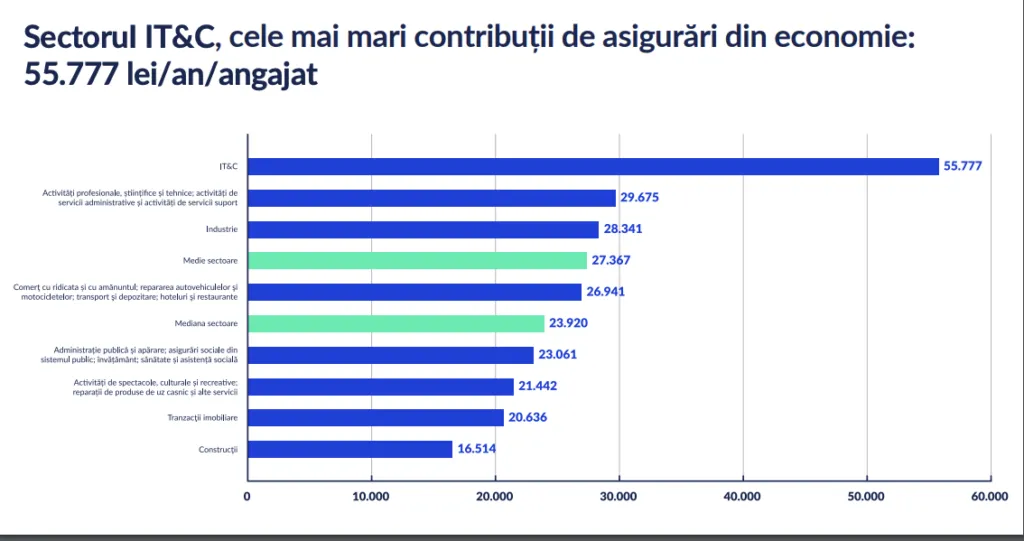 Studiul ANIS mai arată că, în 2023, contribuțiile fiscale ale angajaților din IT au fost cele mai ridicate din economie, ajungând la 55.777 lei per angajat. Comparativ, alte sectoare economice au înregistrat contribuții mai mici, cum ar fi activitățile profesionale și tehnice, cu 29.675 lei per angajat.
